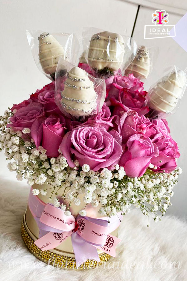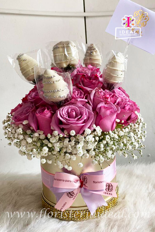 Arreglo floral elaborado en rosas lilas, acompañado por fresas de chocolate y tarjeta para la ocasión