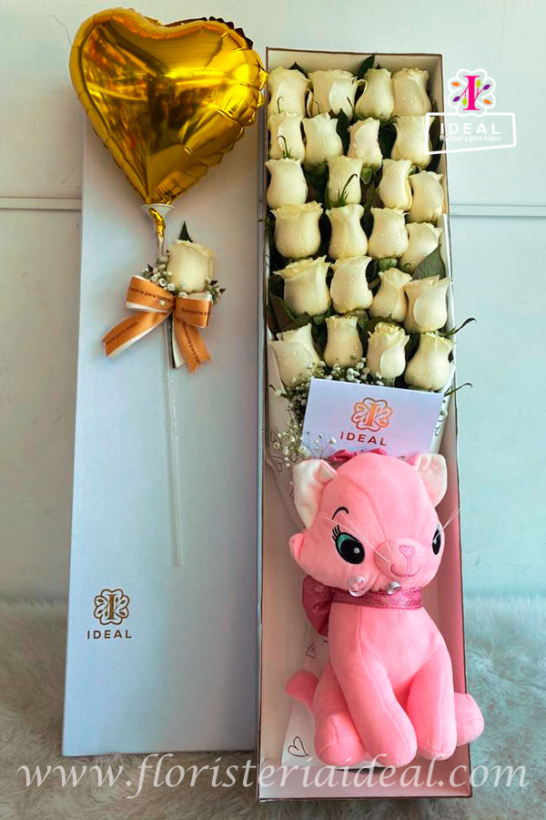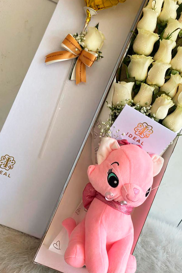 Delicada caja larga de rosas acompañadas y tierno peluche y tarjeta con mensaje deseado para la ocasión.