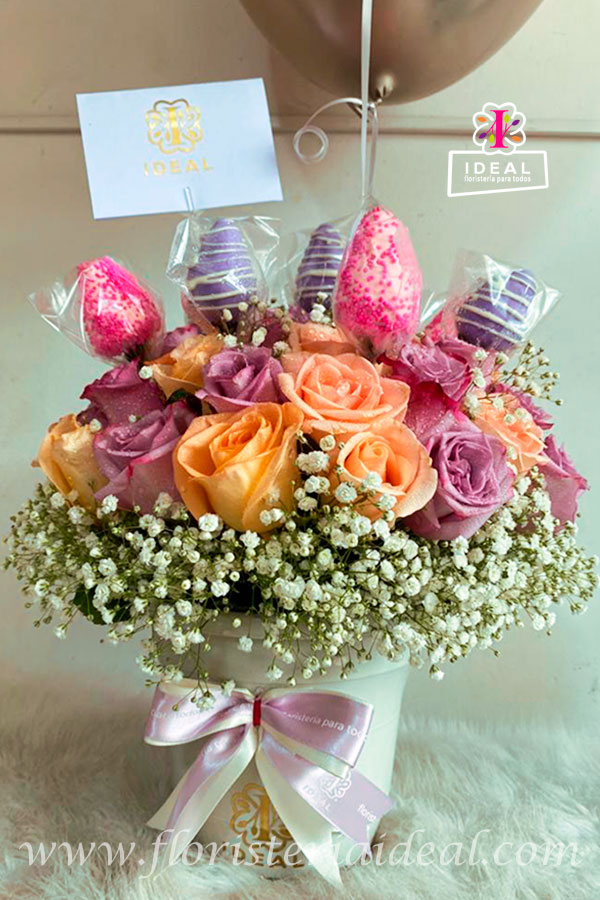Delicado arreglo floral elaborado en bellas rosas y lindos follajes acompañada de choco fresas su base es una linda maseta redonda de pasta. incluye tarjeta para la ocasión con mensaje deseado.