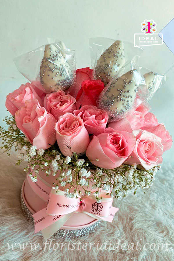 Delicado arreglo floral elaborado en bellas rosas y lindos follajes acompañada de choco fresas su base es una linda caja redonda. incluye tarjeta para la ocasión,