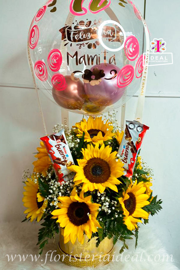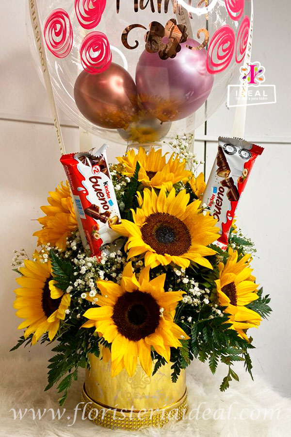 Delicado arreglo floral en forma redonda elaborado en bellos y radiantes girasoles acompañados de ricos chocolates y globo burbuja ,su base es una linda caja con bellos detalles decorativos, incluye tarjeta con mensaje deseado para la ocasión .