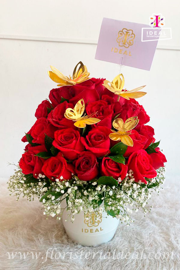Delicado arreglo floral elaborado en bellas rosas ,acompañado de lindas mariposas ramo floral elaborado en balde de pasta con su respectiva tarjeta con mensaje deseado .