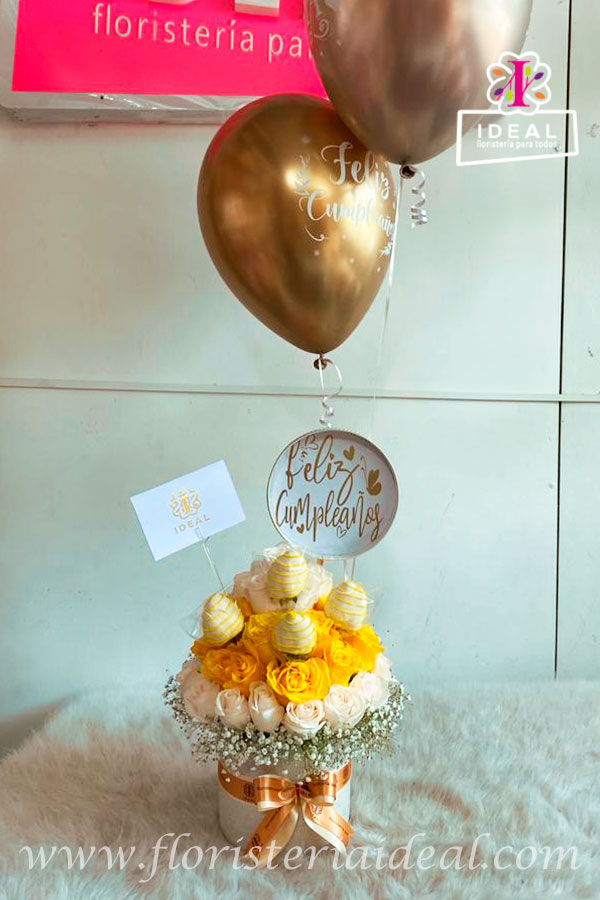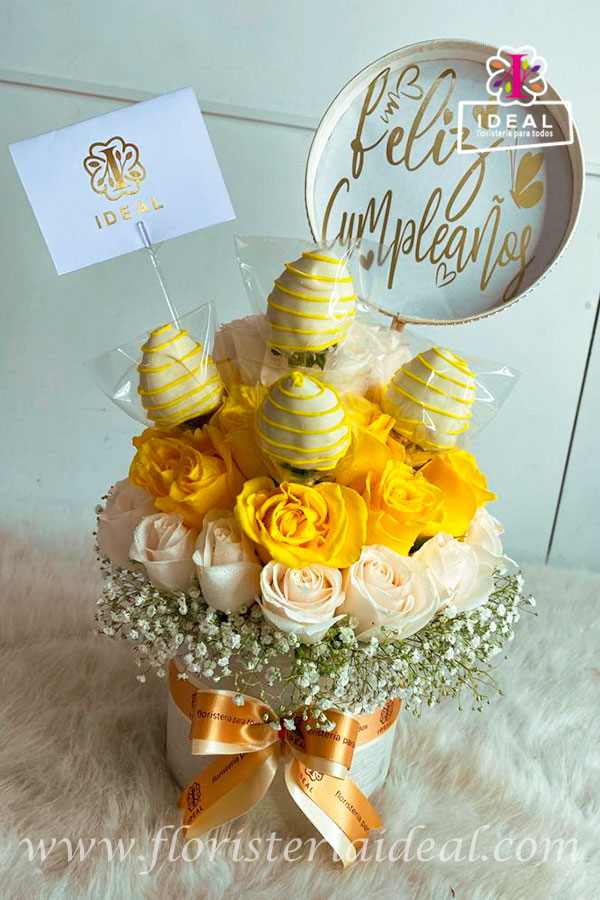 Arreglo floral elaborado en rosas y caja cubierta de material tipo cuerina acompañado por fresas cubiertas de chocolate y tarjeta para la ocasión.