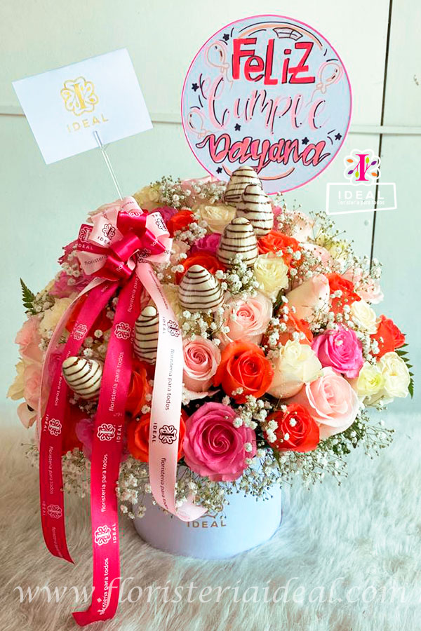 Delicado arreglo floral de una cara , elaborado en bellas rosas y lindos follajes acompañada de choco fresas su base es una linda caja redonda. incluye tarjeta para la ocasión,