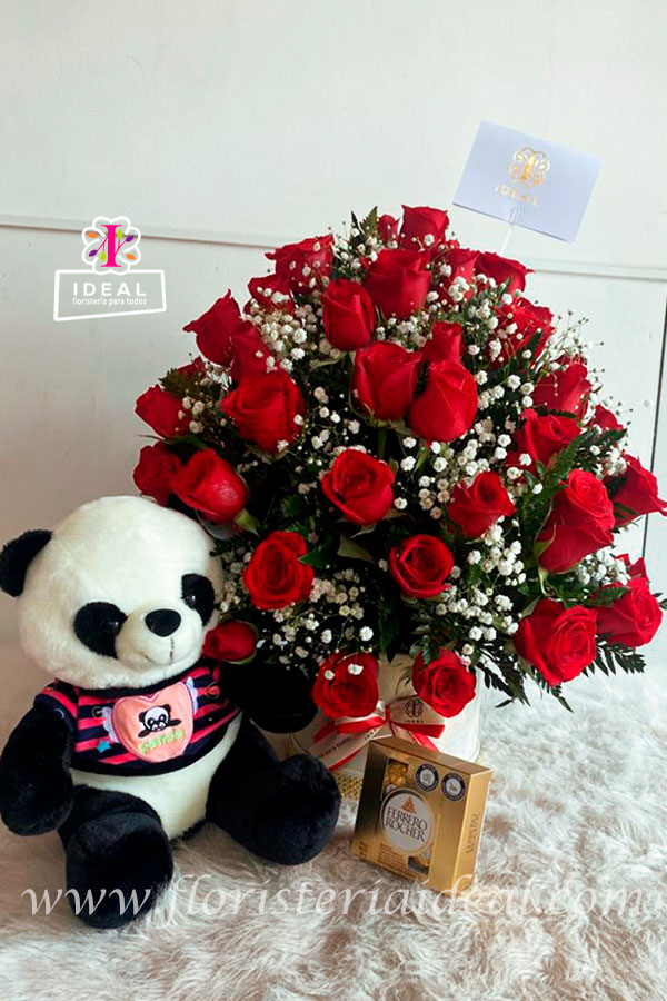 Delicado arreglo floral elaborado en bellas rosas acompañado de tierno peluche y caja de chocolates ferreros mas tarjeta para la ocasión.