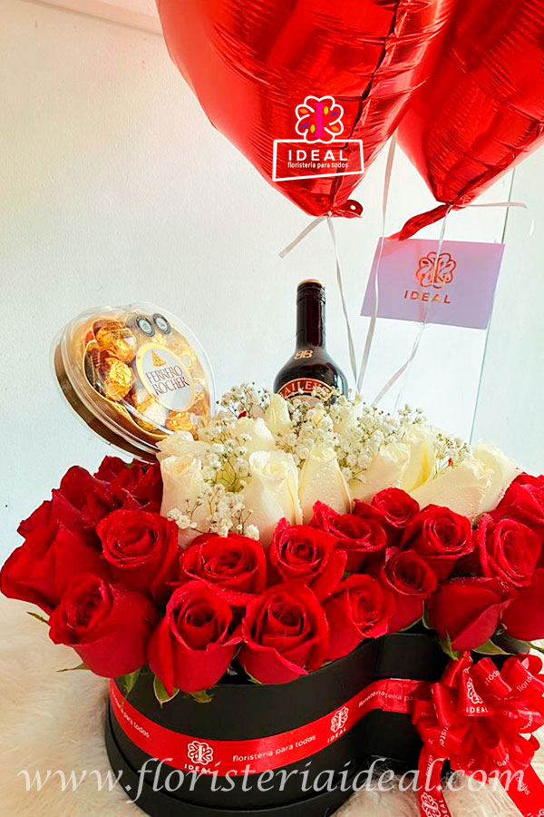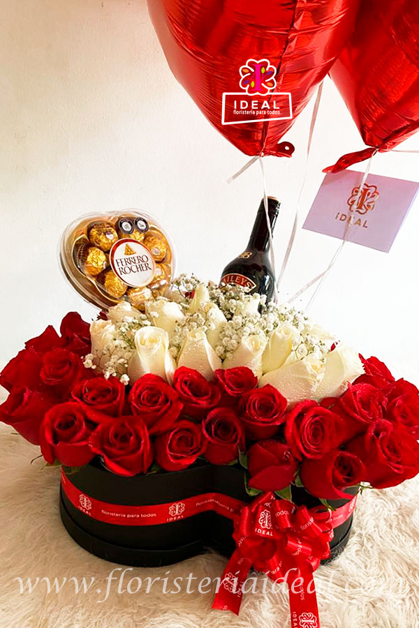 Especial arreglo premium en forma de corazon elaborado con bellas rosas rojas y blancas, acompañado de un estuche de corazon ferrero roche, globos metalizados y una botella baileys de 375 ml, este detalle incluye tarjeta para la ocasión