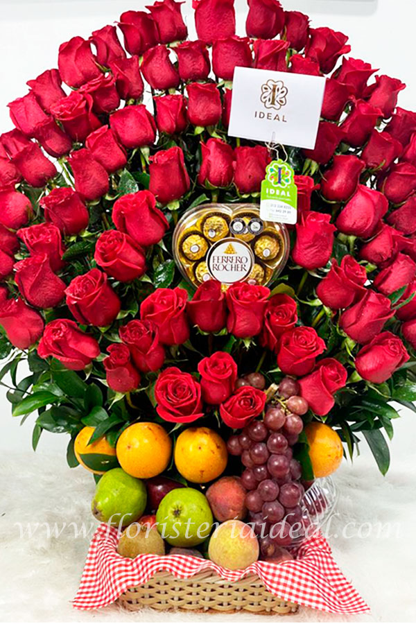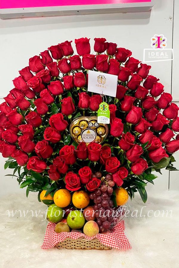 Encantador arreglo floral premium perfecto para regalar a tu persona especial, elaborado en bellas rosas rojas grandes, acompañado de deliciosas frutas y un delicioso chocolate ferrero en forma de corazon, mas tarjeta personalizada para la ocasión.