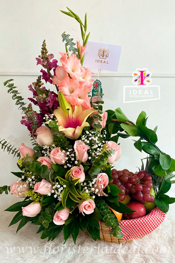 Hermosa canasta llena de amor! Elaborada en gran variedad de flores, acompañada de deliciosas frutas frescas mas tarjeta personalizada para la ocasión.