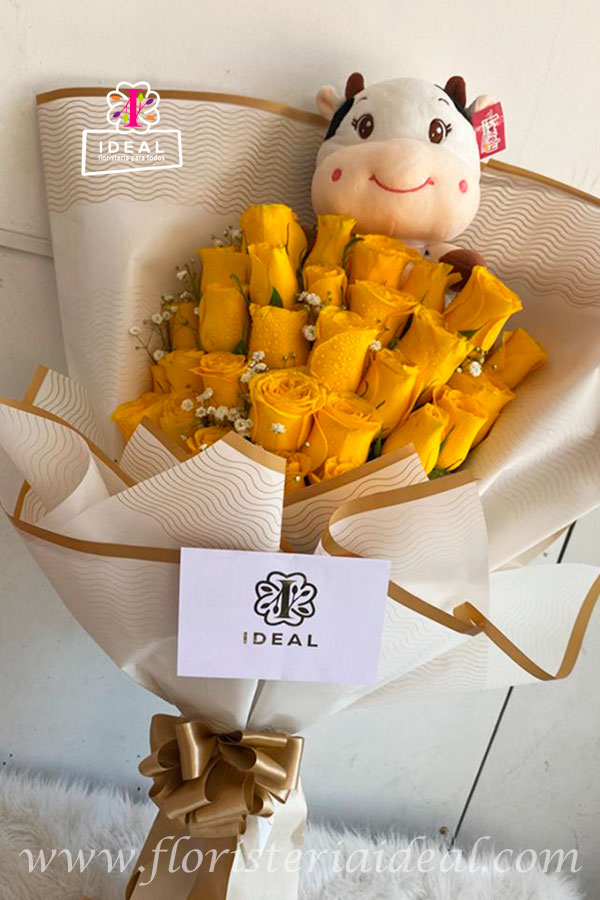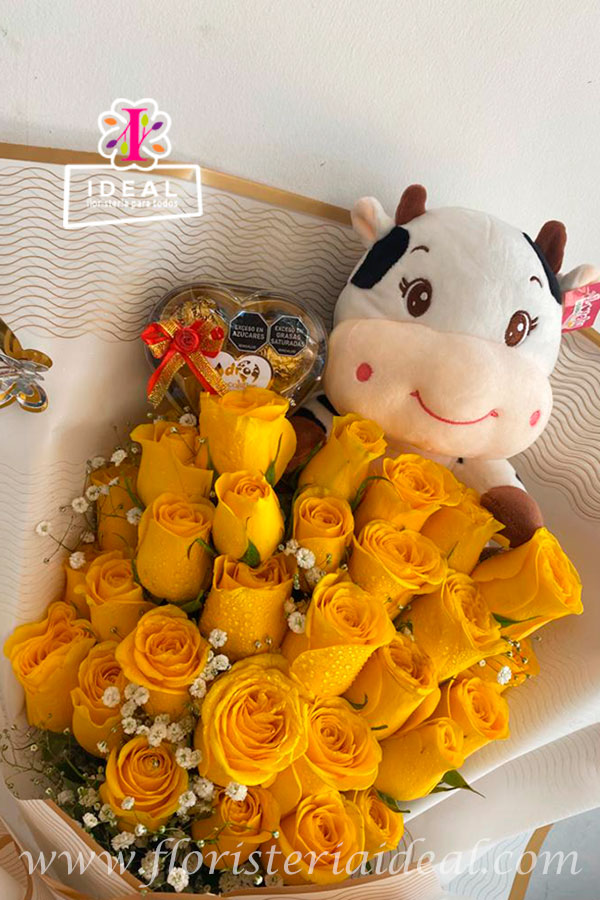 Hermoso bouquet elaborado en bellas rosas amarillas con delicados toques de gipsófila, acompañado de un tierno peluche de vaca, con un delicioso chocolate, mas tarjeta personalizada para la ocasión.