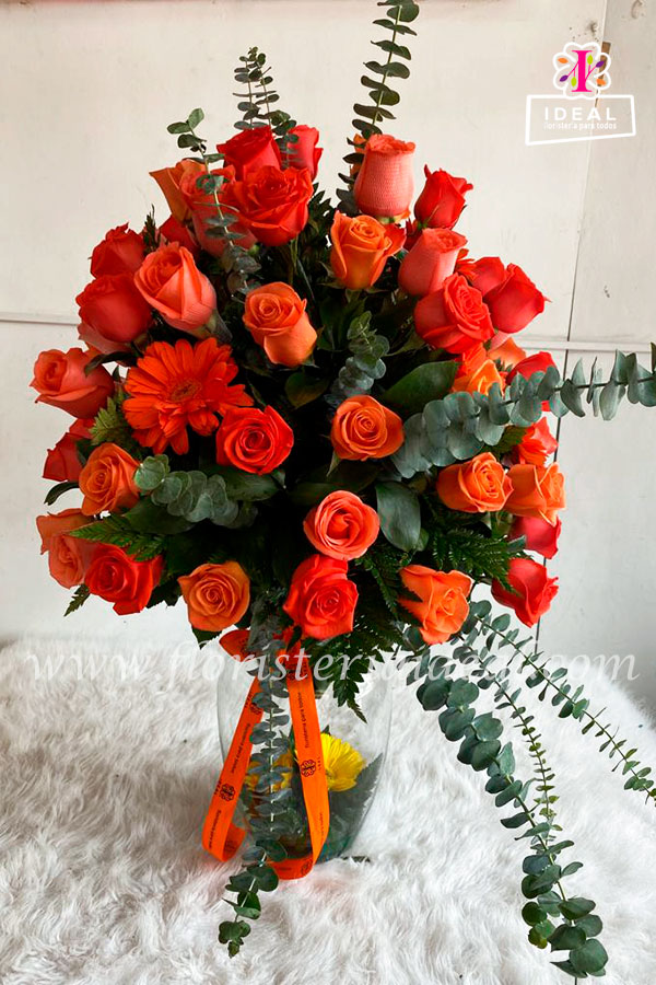 Hermoso arreglo redondo elaborado en variedad de flores naranjas, como rosas, gerberas y lindos follajes verdes, mas tarjeta para la ocasión .