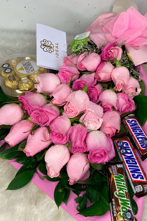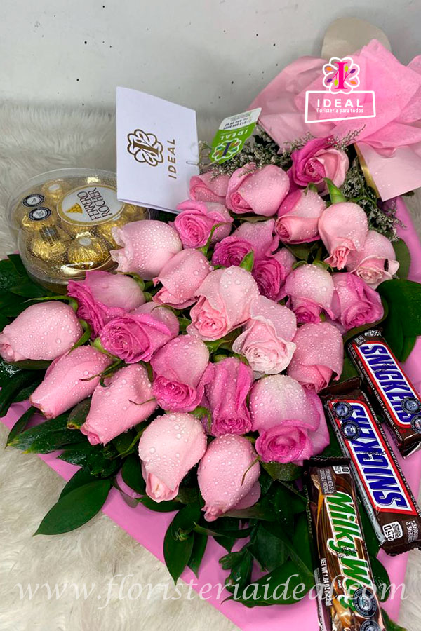 Hermoso bouquet elaborado en bellas y frescas rosas rosadas, acompañado de deliciosos chocolates, como ferrero en estuche de corazon x8 y deliciosas chocolatinas snickers y miky way, mas tarjeta personalizada para la ocasión.