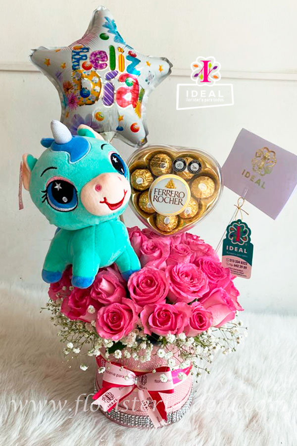Hermoso arreglo floral redondo elaborado en rosas rosadas, acompañado de un delicioso ferrero en estuche de corazon x8, con un tierno peluche de unicornio, mas globo y tarjeta para la ocasión!