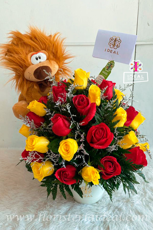Hermoso arreglo floral redondo elaborado en lindas rosas rojas y amarillas con follaje verde, acompañado de un tierno peluche de leon, mas tarjeta personalizada para la ocasión.