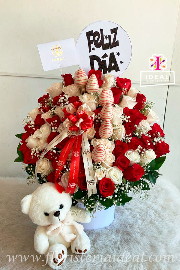 Delicado arreglo floral de una cara , elaborado en bellas rosas rojas y blancas, con lindos toques de gipsófila acompaño de choco fresas y un tierno peluche de os, incluye tarjeta para la ocasión.