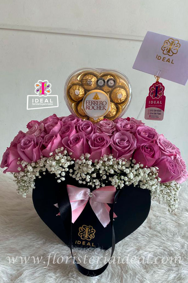 Hermoso arreglo floral con base negra de corazon, elaborado en bellas rosas lila, con delicados toques de gipsófila, acompañado de un delicioso chocolate ferrero x8 en estuche de corazon, mas tarjeta personalizada para la ocasión.