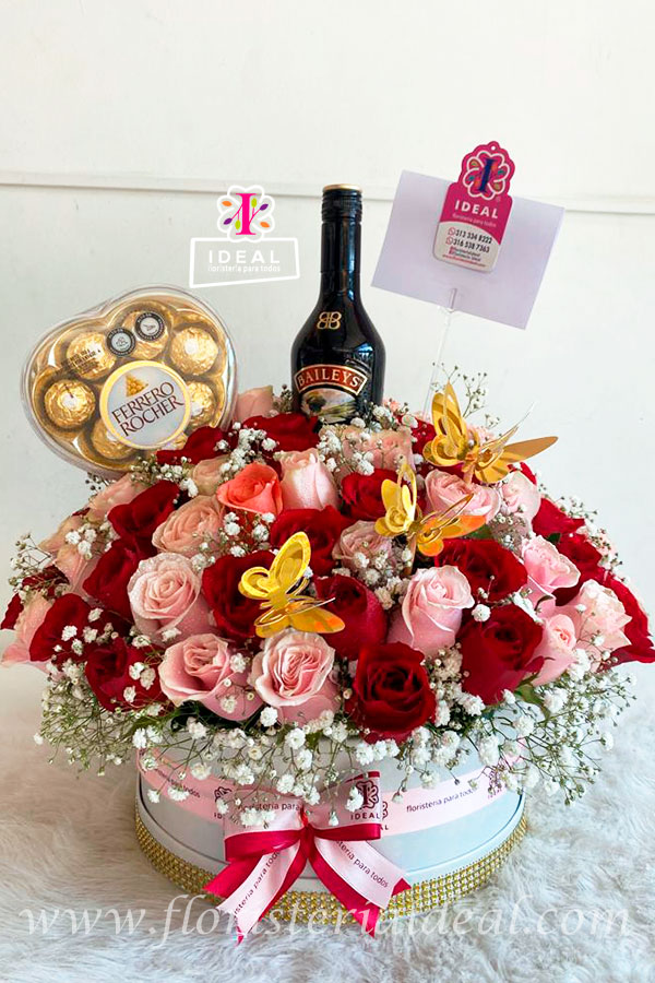 Hermosa caja circular, elaborada en bellas rosas rosadas y rojas, con delicados toques de gipsófila, acompañado de un delicioso chocolate ferrero en estuche de corazon, mas botella de beylis, y tarjeta personalizada para la ocasión.