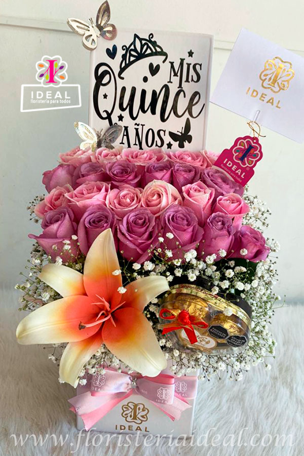 Hermosa caja cuadrada elaborada en lindas rosas rosadas y lila, acompañado de un delicioso chocolate en forma de corazon, mas tarjeta personalizada para la ocasión