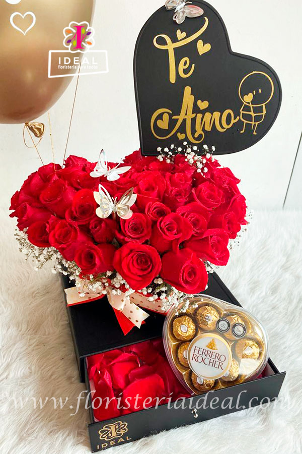 Hermosa caja cofre en forma de corazon, elaborada en bellas rosas rojas, acompañada de deliciosos chocolates ferreros en estuche de corazon, mas tarjeta personalizada para la ocasión.