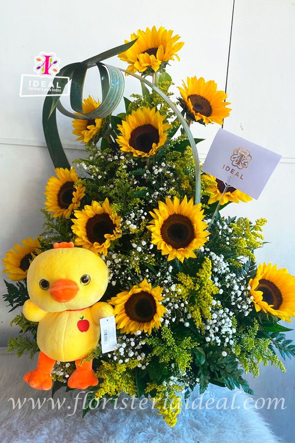 Hermoso arreglo floral en pirámide, elaborado en hermosos girasoles y toques verdes, mas lindo peluche y tarjeta personalizada para la ocasión