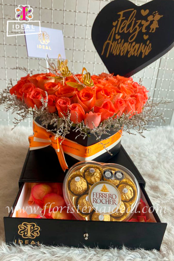 Hermosa caja cajón en forma de corazon elaborada en bellas rosas naranjas acompañada de deliciosos chocolate ferrero en estuche de corazon, mas tarjeta personalizada para la ocasión