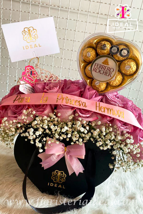 Linda y delicada cartera en forma de corazon elaborada en bellas rosas lila, acompañada de una hermosa corona y deliciosos chocolate ferrero en estuche de corazon, mas tarjeta personalizada para la ocasión.