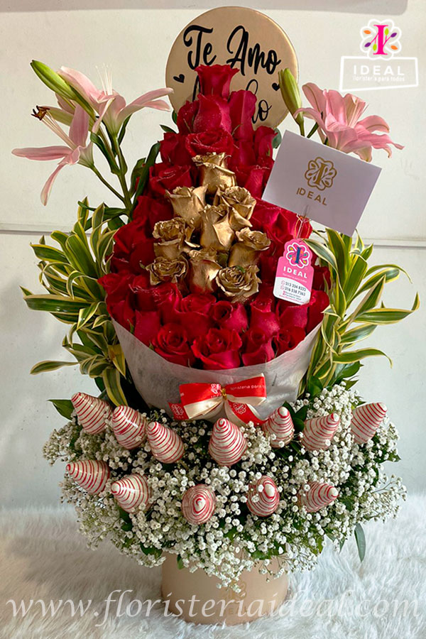 Hermoso arreglo elaborado en lindas rosas rojas y doradas, lirios y follajes verdes, acompañado de deliciosas chocofresas mas tarjeta personalizada para la ocasion