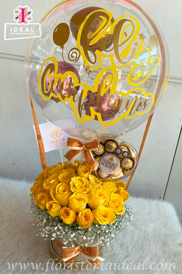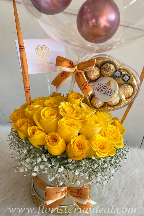 Hermoso arreglo floral redondo elaborado en bellas rosas amarillas, acopañado de deliciosos chocolate ferrero en estuche de corazon, con lindo goblo y tarjeta personalizada..