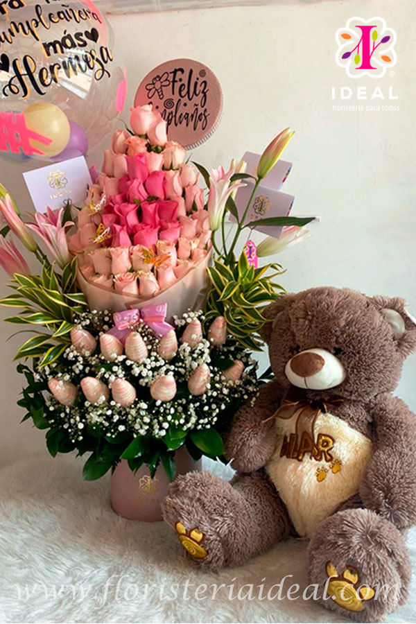 Lindo ramo floral en rosas hermosas acompañado de fresas cubiertas de chocolate y tierno peluche de oso, mas tarjeta con mensaje deseado para la ocasión