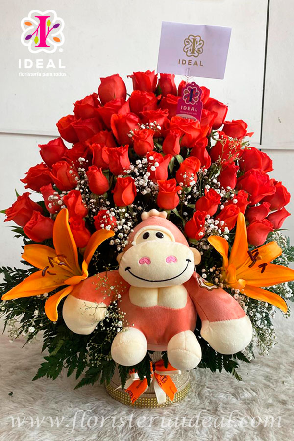 Hermoso arreglo grande elaborado en bellas rosas naranjas y lindo peluche mas tarjeta personalizada para la ocasión.