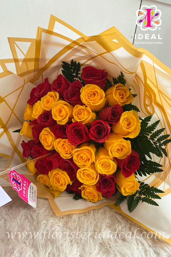 Hermoso buquet de 50 rosas elaborado en linda rosa roja y amarilla, mas tarjeta personalizada para la ocasión