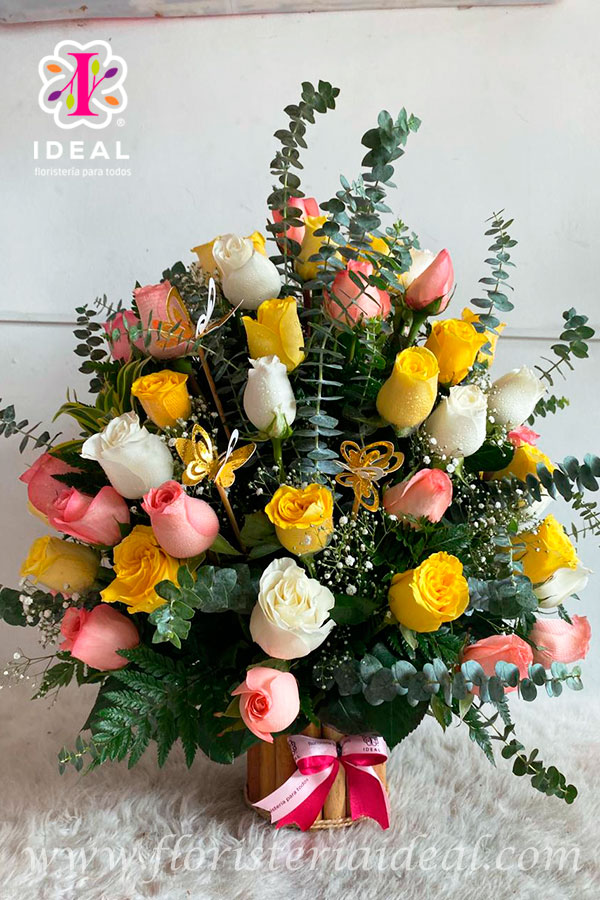 Hermoso arreglo floral redondo elaborado en lindas rosas amarillas blancas y rosadas, con hermosos follajes verdes mas tarjeta personalizada para la ocasión