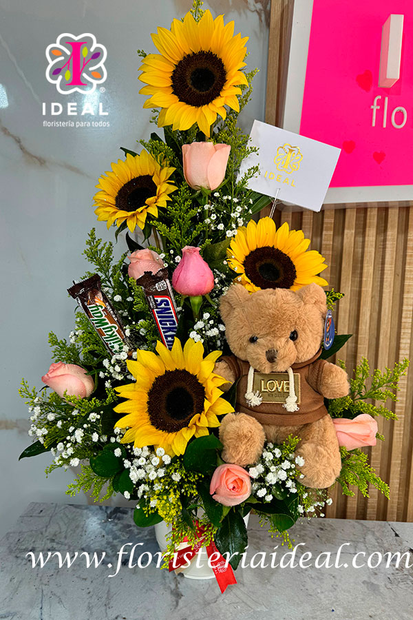 hermoso arreglo floral elaborado con girasoles, rosas de tu preferencia, chocolates y un hermoso peluche