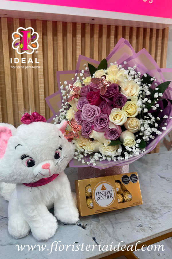 espectacular arreglo de mano aacompañado de un hermoso peluche junto a unos ferrero