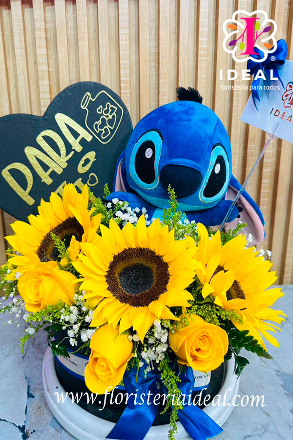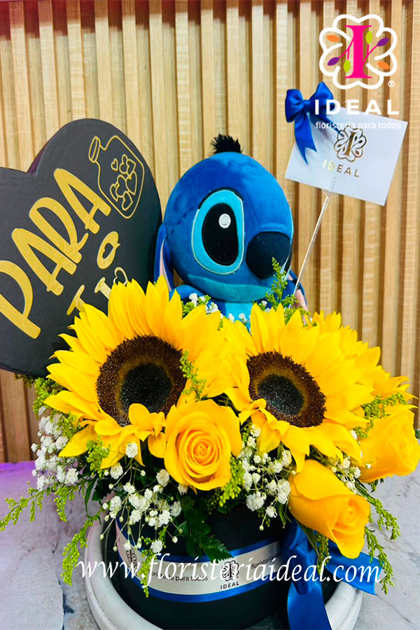 Hermoso arreglo en caja elegante en forma de corazon, acompañada de un Stich, con una linda cinta decorativa y una tarjeta personalizada. Elaborado con rosas, girasoles, y follajes verdes.