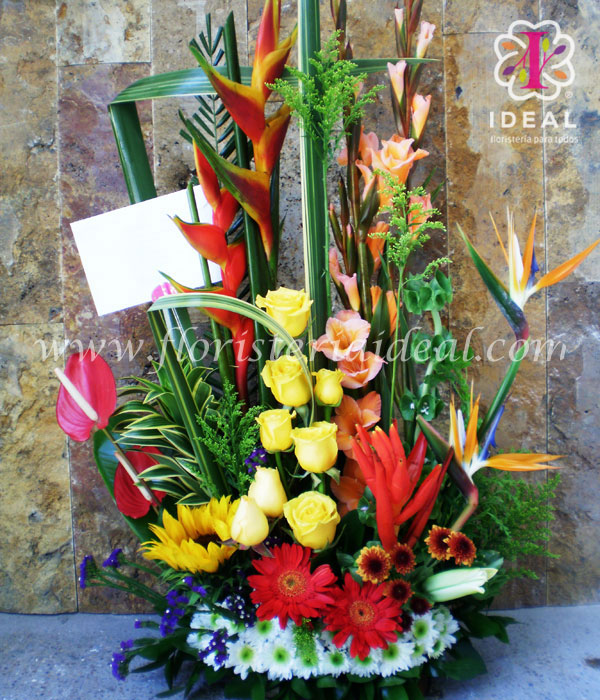 Hermoso arreglo exotico con apariencia tropical acompañado de linda tarjeta para la ocasión.
