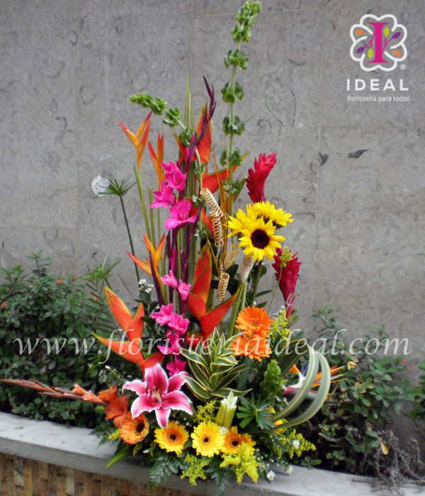 Fantástico arreglo exótico de iliconias, campanas de irlanda, pajaritos, gladiolos, topiaro en girasoles, lirios, surco en gérberas, ginges y hojas de lino en forma circular. Su base es en cerámica