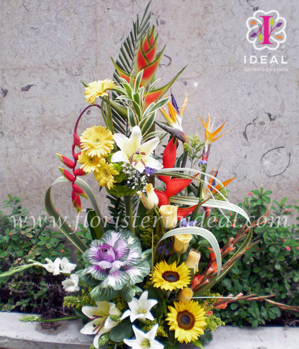 Expresale todos tus deseos de pronta recuperación a tu ser querido, con este lindo arreglo exótico creado con iliconias, aves de paraiso, detalles exclusivos como un topiario aéreo en gérberas, coquetas y lirio. Se complementa con asucenas, flor de col, girasoles y hojas de lino en forma circular.