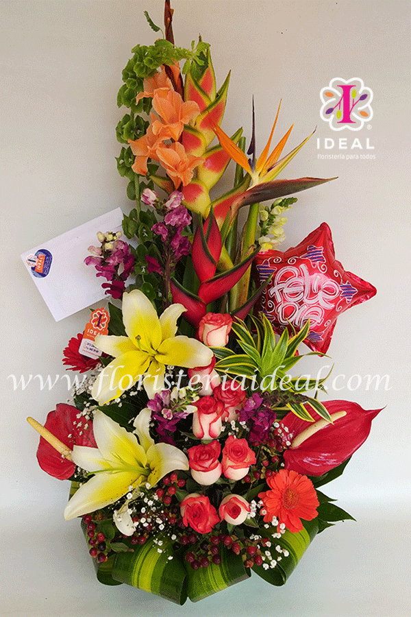 Bello arreglo floral elaborado con flores surtidas y lindos follajes verdes esta acompañado de tarjeta para la ocasión.