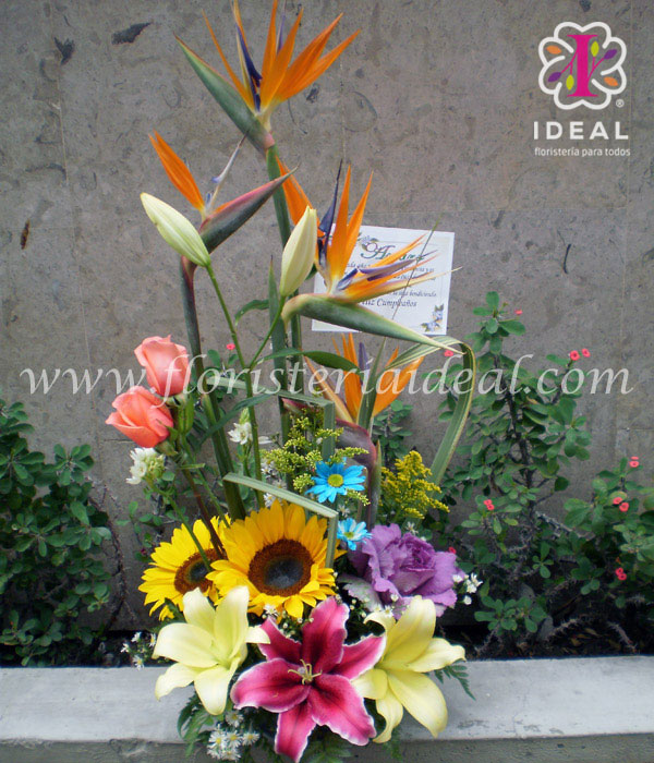 Arreglo minimalista con aves de paraiso, flor de col, lirios y girasoles