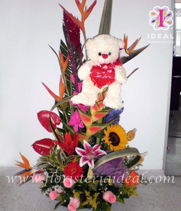 Hermoso arreglo con flores exóticas, incluye peluche