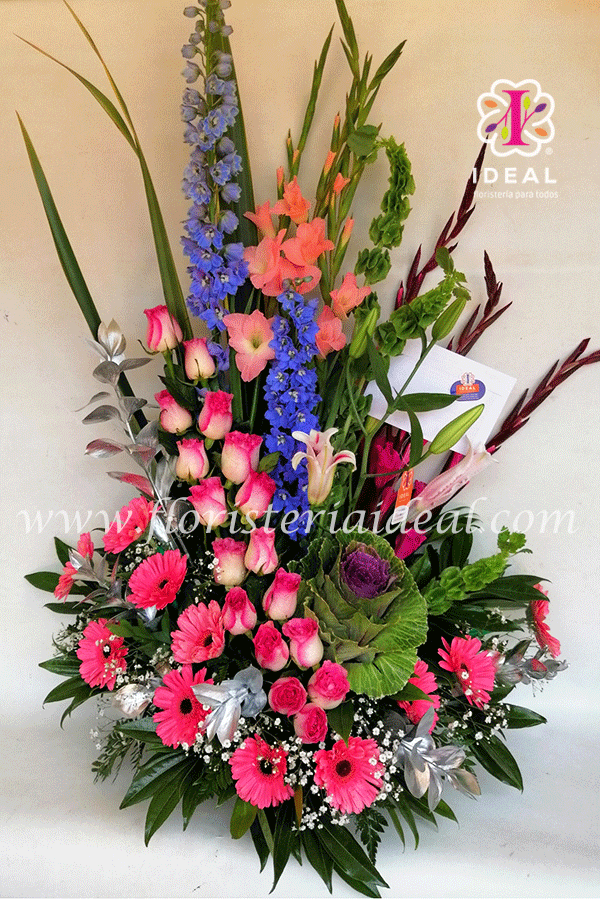 Delicado arreglo floral elaborado con hermosas flores silvestres y bellos follajes verdes esta acompañado de linda tarjeta para la ocasión.