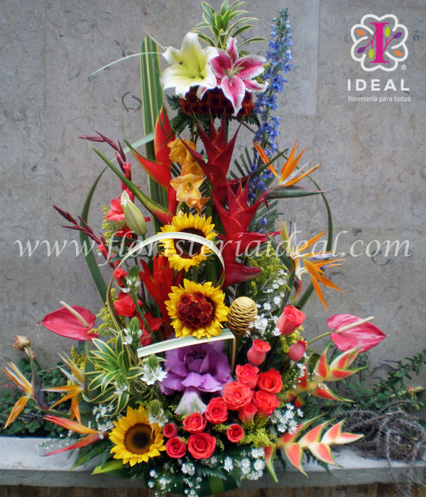 Ramo de doble sección con surco en rosas y topiario aéreo enj lirios.