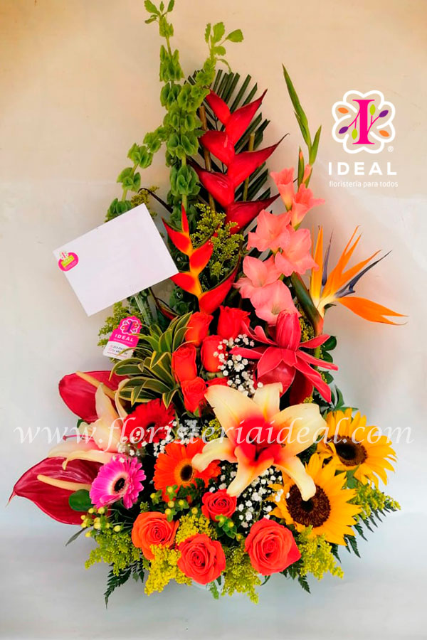 Espectacular arreglo exótico acompañado de variedad de flores tropicales y tarjeta para la ocasión.