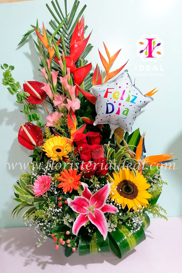 Delicado arreglo floral exótico elaborado en gran variedad de flores tropicales acompañado de globo metalizado y tarjeta para la ocasión.