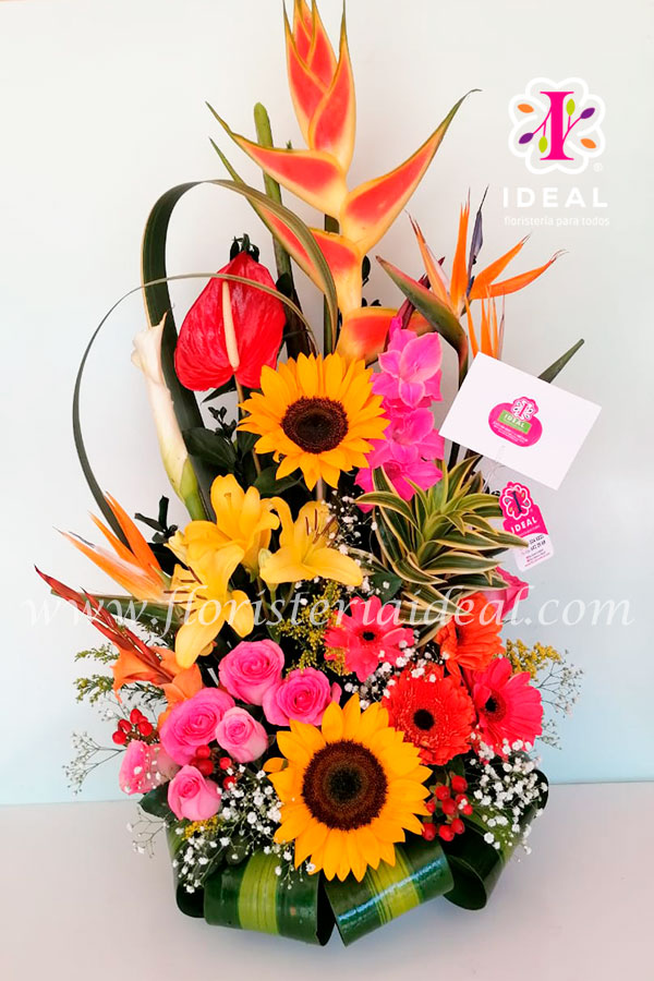 Espectacular arreglo exótico elaborado en gran variedad de flores tropicales acompañado de delicada tarjeta para la ocasión.
