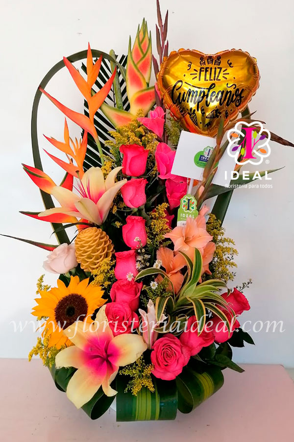 espectacular arreglo floral con variedad de flores exótica acompañado de delicado globo para la ocasión y tarjeta personalizada.