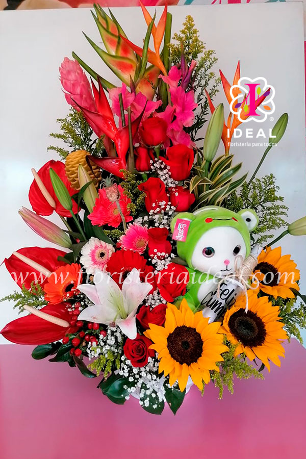 Especial arreglo exotico elaborado en variedad de flores tropicales acompañado de tierno peluche de ranita y tarjeta para la ocasión.