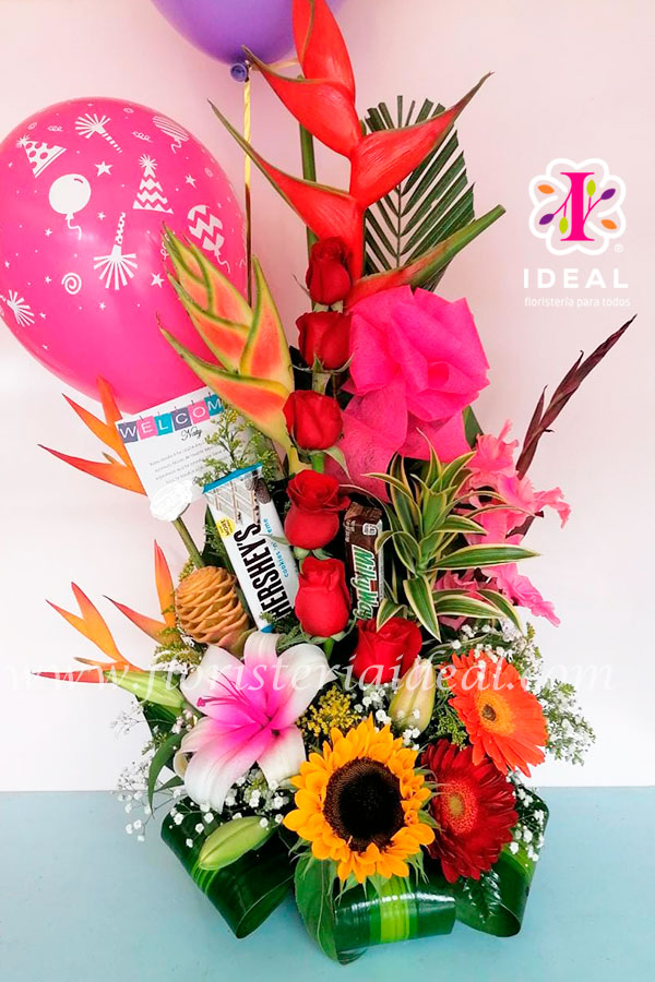 Espectacular arreglo floral con variedad de flores exótica acompañado de globos en helio y tarjeta personalizada para la ocasión.