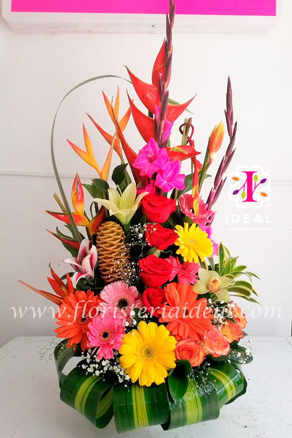 Espectacular arreglo floral con variedad de flores exótica acompañado de tarjeta personalizada.