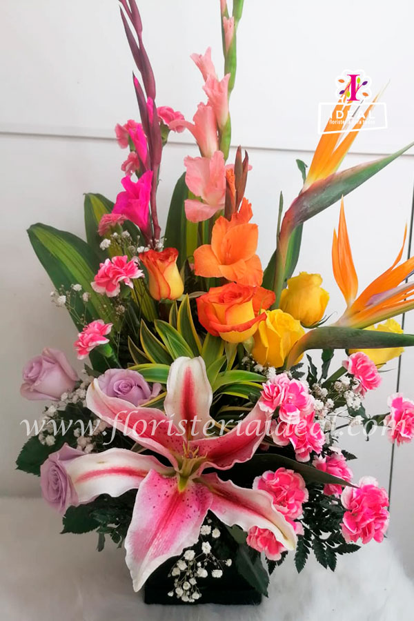 Hermoso arreglo floral de tipo exótico, elaborado en bellas flores tropicales. Incluye tarjeta para ocasión.